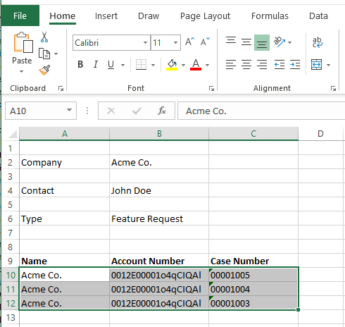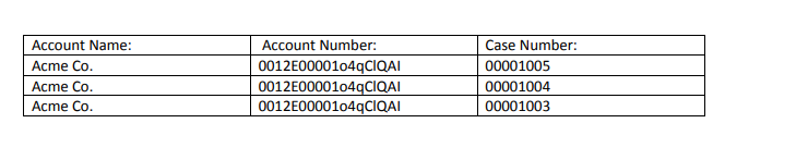 For example, say you want to create multiple rows of data in a table for each Case number related to the Acme Co. Account. Below will show detailed instructions depending on which Microsoft program you are using.