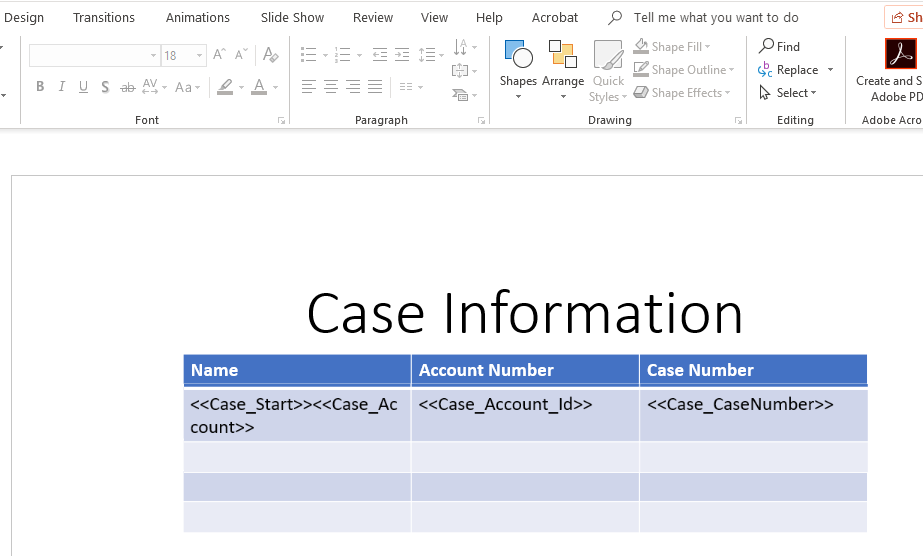 For example, if you have six rows in your data that you want to replicate, you'll want to create six rows or more in your table. Nintex DocGen will create extra slides if you have more data than the rows that are displayed in your table. - Once the tag is placed in your PowerPoint document, you can assign other child object tags to the columns within your table. When a document is generated, the PowerPoint file receives three rows of data.