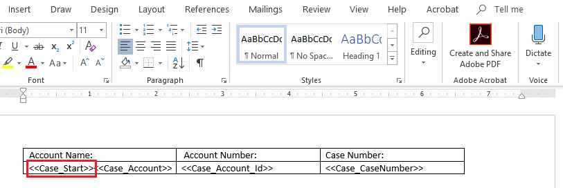 The tagged document below is what we'll use for our Word example. When we run the DocGen Package, you should receive multiple rows of data with the Case information.