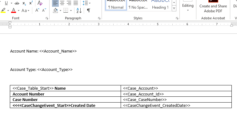 In this example, we will be replicating rows and tables of data in a document for each Case number related to the Acme Co. Account, as well as when the account was created.