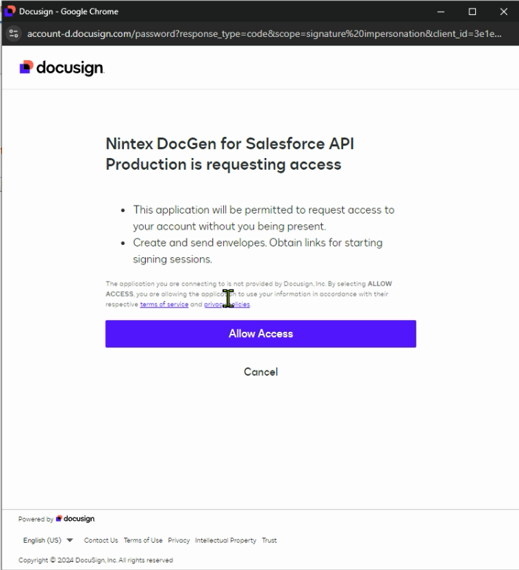 When generating a document while using the DocuSign delivery option, you will see the following pop-up asking you to authorizing Nintex DocGen to work with DocuSign for your account.