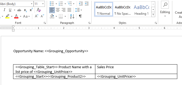 <<Grouping_Start>>, followed by the data tags for each additional row<<Grouping_Product2>>and<<Grouping_UnitPrice>>.- For more information on row and table replication, see Row Replication and Table and Slide Replication.