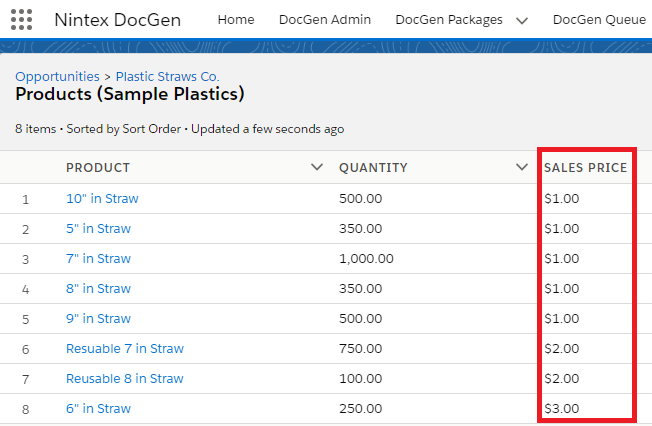 For example, say you want to group product line items on the Opportunity object by sales price. In the image below, you will see a custom product line for Plastic Straws Co. In your output document, each product with the same sales price will appear in a table. If you have three sales prices, you will have three different tables.