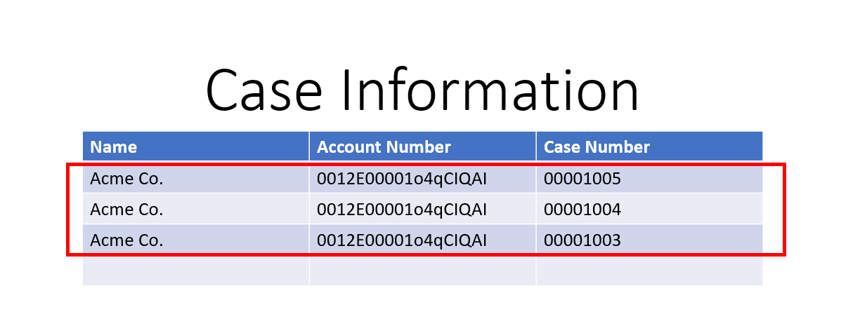 For example, say you want to create multiple rows of data in a table for each Case number related to the Acme Co. Account. Below will show detailed instructions depending on which Microsoft program you are using.