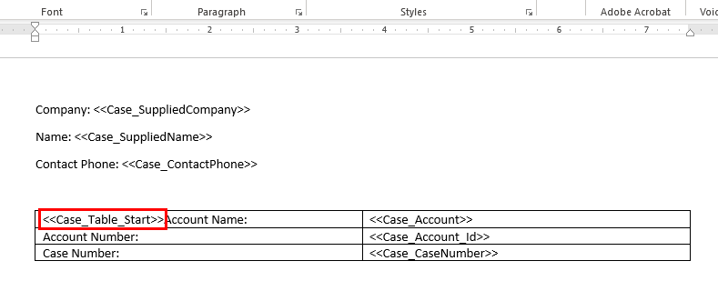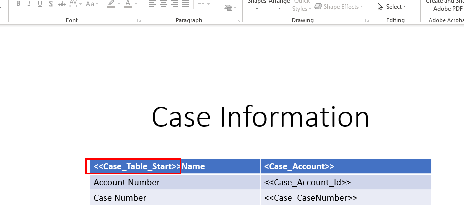 In this example, we will be replicating rows and tables of data in a document for each Case number related to the Acme Co. Account, as well as when the account was created.