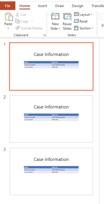 - Once generated, three slides of data were inserted into the Microsoft PowerPoint document, like below.