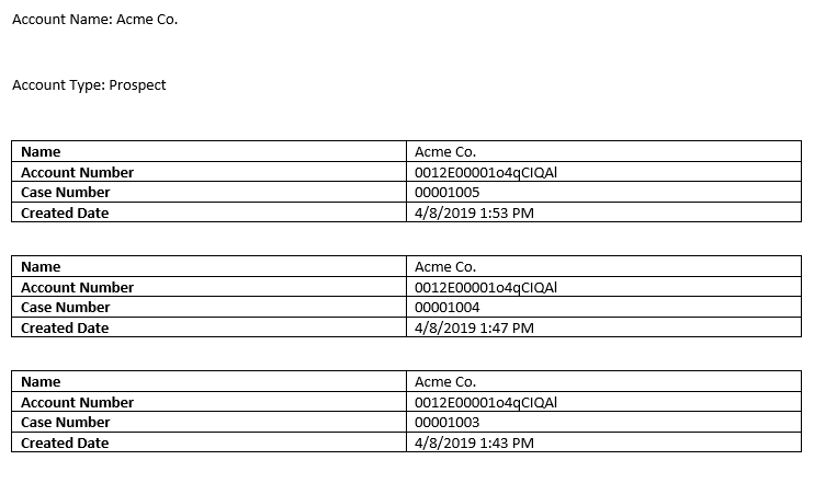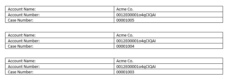 For example, say you want to create multiple tables of data in a document for each Case number related to the Acme Co. Account. Below will show detailed instructions depending on which Microsoft program you are using.